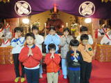 町探検2回目は、芦峅寺のえんま様に会いに行きました。えんま堂のえんま様は、迫力満点の怖い顔をしてみんなを迎えてくれました。えんま堂を守っている佐伯照代さんからえんま様の仕事や思いを教えてもらいました。また、立山博物館では、立山曼荼羅を見せていただき、えんま様が芦峅寺にいる訳や、立山に地獄と天国があることを教えてもらいました。子供たちは、「最初は怖かったけれど、本当は、自分たちのことを思ってくれているいい人なんだね。ありがとう。」とえんま様のすてきを見付けました。